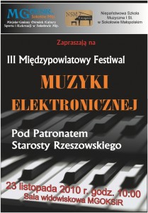 Już wkrótce w Sokołowie Małopolskim zabrzmią dźwięki klawiszowych instrumentów elektronicznych. 23 listopada 2010 roku odbędzie się III Międzypowiatowy festiwal Muzyki Elektronicznej – Sokołów 2010. Wystąpią uczniowie szkół muzycznych, ognisk muzycznych, placówek kulturalnych i niezrzeszeni amatorzy zajmujący się grą na instrumentach popularnie nazywanych “keyboard”. W konkursie mogą brać udział uczestnicy w wieku od 7 do 19 roku życia.