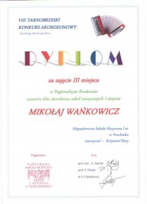 • III miejsce wśród najmłodszych akordeonistów w VIII Tarnobrzeskim Konkursie Akordeonowym o zasięgu ogólnopolskim, który odbył się 21.05.2014.