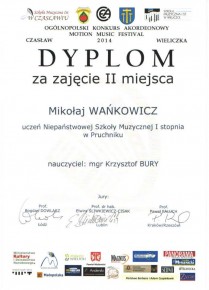 • II miejsce w Ogólnopolskim Festiwalu Akordeonowym Motion Music Festival – Wieliczka 2014. Konkurs odbywał się od 15 do 17 maja 2014 roku. Mikołaj wystąpił 16.05.2014 w kategorii II.