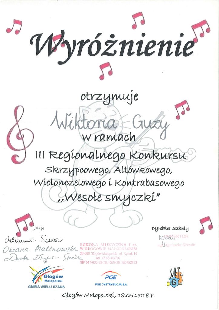 16 maja 2018 roku odbył się Regionalny Konkurs skrzypcowy , altówkowy, wiolonczelowy i kontrabasowy „Wesołe smyczki” w Głogowie Małopolskim. Z satysfakcją informujemy, że Wiktoria Guzy uczennica Niepaństwowej Szkoły Muzycznej I stopnia w Sokołowie Małopolskim w klasie skrzypiec p. Natalii Kmity otrzymała wyróżnienie.