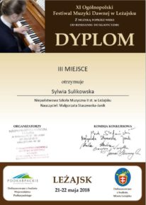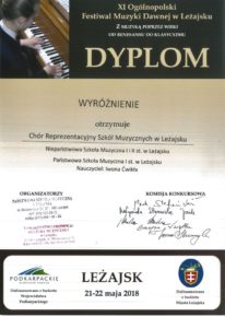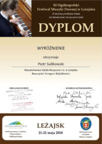 W dniach 21 i 22 maja odbył się XI Ogólnopolski Festiwal Muzyki Dawnej w Leżajsku. Wzięło w nim udział 211 uczniów ze szkół muzycznych I i II stopnia. Część konkursową oceniało Jury w składzie: Marek Stefański – przewodniczący (Akademia Muzyczna w Krakowie), Małgorzata Staszewska-Janik (Akademia Muzyczna w Krakowie), Tomasz Ślusarczyk (Akademia Muzyczna w Krakowie i Uniwersytet Muzyczny Fryderyka Chopina w Warszawie), Urszula Buda (Uniwersytet Rzeszowski) i Grzegorz Wziątka (Państwowa Szkoła Muzyczna I st. w Leżajsku i Państwowa Szkoła Muzyczna I i II st. w Stalowej Woli). Z wielką satysfakcją informujemy, że trzy prezentacje realizowane przez uczniów Podkarpackiego Zespołu Niepaństwowych Szkół Muzycznych znalazły uznanie w oczach Jurorów i zostały wysoko ocenione. Dyplomy z wyróżnieniami trafiły do Piotra Sulikowskiego z klasy fortepianu p. Grzegorza Wójcikiewicza i do Chóru Reprezentacyjnego Szkół Muzycznych w Leżajsku prowadzonego przez p. Iwonę Ćwikła. III miejsce w kategorii prezentacji uczniów szkół muzycznych II stopnia otrzymała Sylwia Sulikowska z klasy skrzypiec p. Małgorzaty Staszewskiej-Janik.