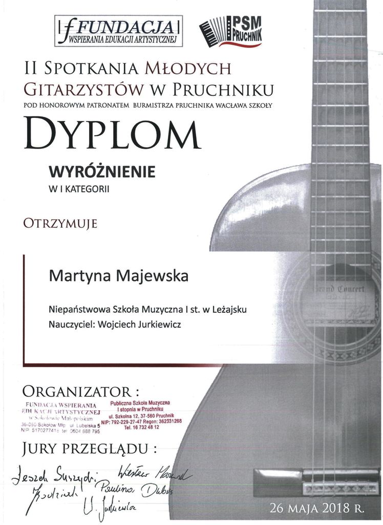 Martyna Majewska uczennica Niepaństwowej Szkoły Muzycznej I stopnia w Leżajsku w klasie gitary p. Wojciech Jurkiewicza wzięła udział w II Spotkaniach Młodych Gitarzystów w Pruchniku. Konkurs odbył się 26 maja 2018 roku w Publicznej Szkole Muzycznej I stopnia w Pruchniku i zgromadził 54 uczestników z Województwa Podkarpackiego i Województwa małopolskiego. Uczestników oceniało Jury w składzie: dr hab. Leszek Suszycki – przewodniczący, Wojciech Jurkiewicz, Iwona Bodziak, Paulina Dubis i Wiesław Mazurek.