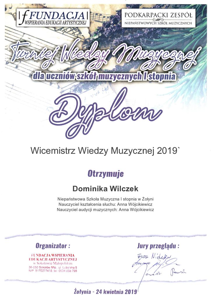 Dominika Wilczek uczennica Niepaństwowej Szkoły Muzycznej I stopnia w Żołyni została laureatką Turniej Wiedzy Muzycznej w Żołyni i otrzymała dyplom Wicemistrza Wiedzy Muzycznej 2019 roku. Turniej Wiedzy Muzycznej dla uczniów szkół muzycznych I stopnia – Żołynia 2019 odbył się 24 kwietnia 2019 roku w Gminnym Ośrodku Kultury w Żołyni. Organizatorami przedsięwzięcia były instytucje: Gminny Ośrodek Kultury w Żołyni, Niepaństwowa Szkoła Muzyczna I st. w Żołyni i Fundacja Wspierania Edukacji Artystycznej w Sokołowie Małopolskim. Zmagania turniejowe oceniało Jury w składzie: dr Ewa Nidecka (wykładowca Uniwersytetu Rzeszowskiego i nauczyciel NSM I st. w Sokołowie Małopolskim – przewodnicząca Jury), Anna Wójcikiewicz (prezes Fundacji Wspierania Edukacji Artystycznej i dyrektor Podkarpackiego Zespołu Niepaństwowych Szkół Muzycznych) i Stanisław Jaworski (dyrektor Państwowej Szkoły Muzycznej I st. w Leżajsku i dyrektor dydaktyczny w NSM I i II st. w Leżajsku i w Sokołowie Małopolskim). W zmaganiach wzięło udział 63 uczniów ze szkół muzycznych Województwa Podkarpackiego.