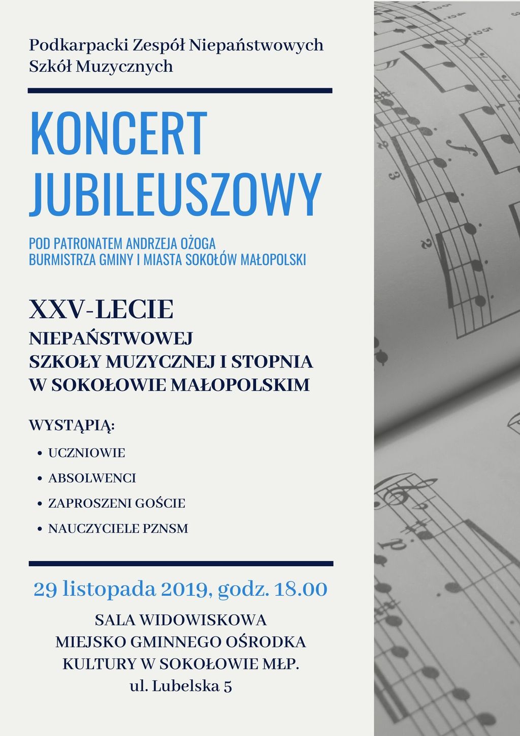 Z wielką przyjemnością informujemy o przyjęciu patronatu przez Pana Andrzeja Ożoga Burmistrza Gminy i Miasta Sokołów Małopolski nad Koncertem z Okazji XXV-lecia Niepaństwowej Szkoły Muzycznej I st. w Sokołowie Małopolskim. Uroczystość odbędzie się 29 listopada 2019 roku o godzinie 18.00 w Sali Widowiskowej Miejsko Gminnego Ośrodka Kultury Sportu i Rekreacji w Sokołowie Małopolskim. Wystąpią uczniowie szkoły, absolwenci, nauczyciele i zaproszeni artyści.