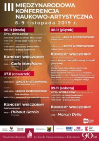 Uczniowie Niepaństwowej Szkoły Muzycznej I i II st. w Leżajsku, Niepaństwowej Szkoły Muzycznej I st. w Sokołowie Małopolskim, Państwowej Szkoły Muzycznej I st. w Leżajsku, Zespołu Szkół Muzycznych nr 2 w Rzeszowie i Publicznej Szkoły Muzycznej I st. w Pruchniku wzięli udział w III Międzynarodowej Konferencji Naukowo-Artystycznej w Katowicach, która odbywała się w dniach 6-9 listopada 2019 roku w Akademii Muzycznej w Katowicach. W ramach konferencji wzięły udział w wykładzie dr Dariusza Kupińskiego i w prezentacji instrumentów lutniczych Rafała Gajdzika i Aleksandra Benedykta. Naszą grupę reprezentowali: Agnieszka Skiba, Martyna Danak, Aleksandra Madej, Katarzyna Krauz, Julia Szajnar, Zuzanna Szałaj, Maria Gnatek i Michał Chudzik. Opiekę nad uczniami sprawowali nauczyciele: Wojciech Jurkiewicz, Krzysztof Skoczyński i Iwona Ćwikła.