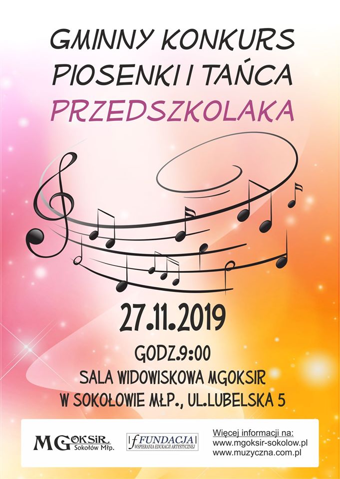 Karty zgłoszenia i regulamin dostępne są na stronie: http://www.mgoksir-sokolow.pl/index.php/53-gminny-konkurs-piosenki-i-tanca-przedszkolaka?date=2019-11-27-09-00