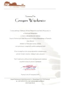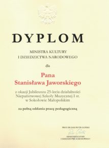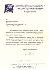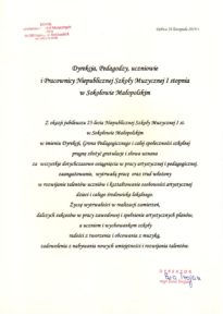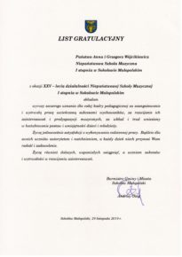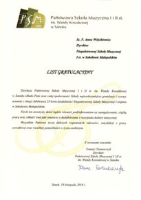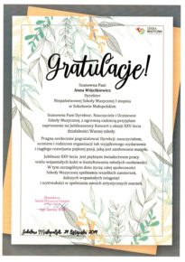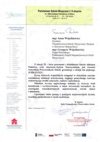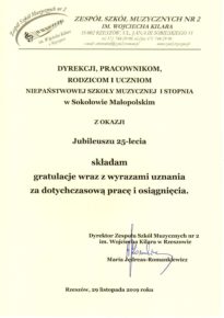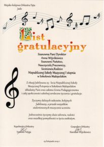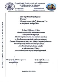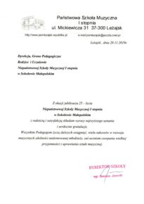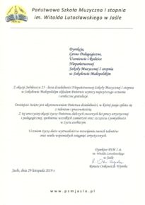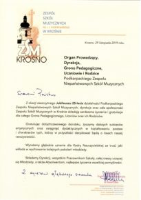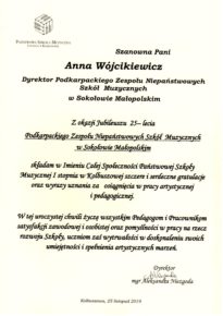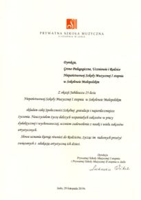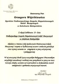 W związku z obchodzonym Jubileuszem XXV-lecia Niepaństwowej Szkoły Muzycznej I st. w Sokołowie Małopolskim na ręce dyrekcji Podkarpackiego Zespołu Niepaństwowych Szkół Muzycznych zostały przekazane listy gratulacyjne i dyplomy uznania. Jesteśmy niezmiernie wdzięczni za wszystkie dobre słowa skierowane pod naszym adresem. Dziękujemy bardzo.