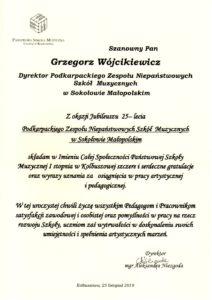 Gratulacje i Dyplomy z okazji Jubileuszu XXV-lecia Niepaństwowej Szkoły Muzycznej I st. w Sokołowie Małopolskim