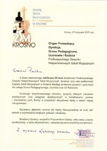 Gratulacje i Dyplomy z okazji Jubileuszu XXV-lecia Niepaństwowej Szkoły Muzycznej I st. w Sokołowie Małopolskim