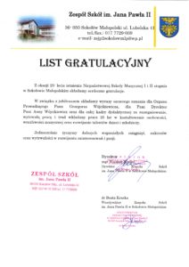 Gratulacje i Dyplomy z okazji Jubileuszu XXV-lecia Niepaństwowej Szkoły Muzycznej I st. w Sokołowie Małopolskim