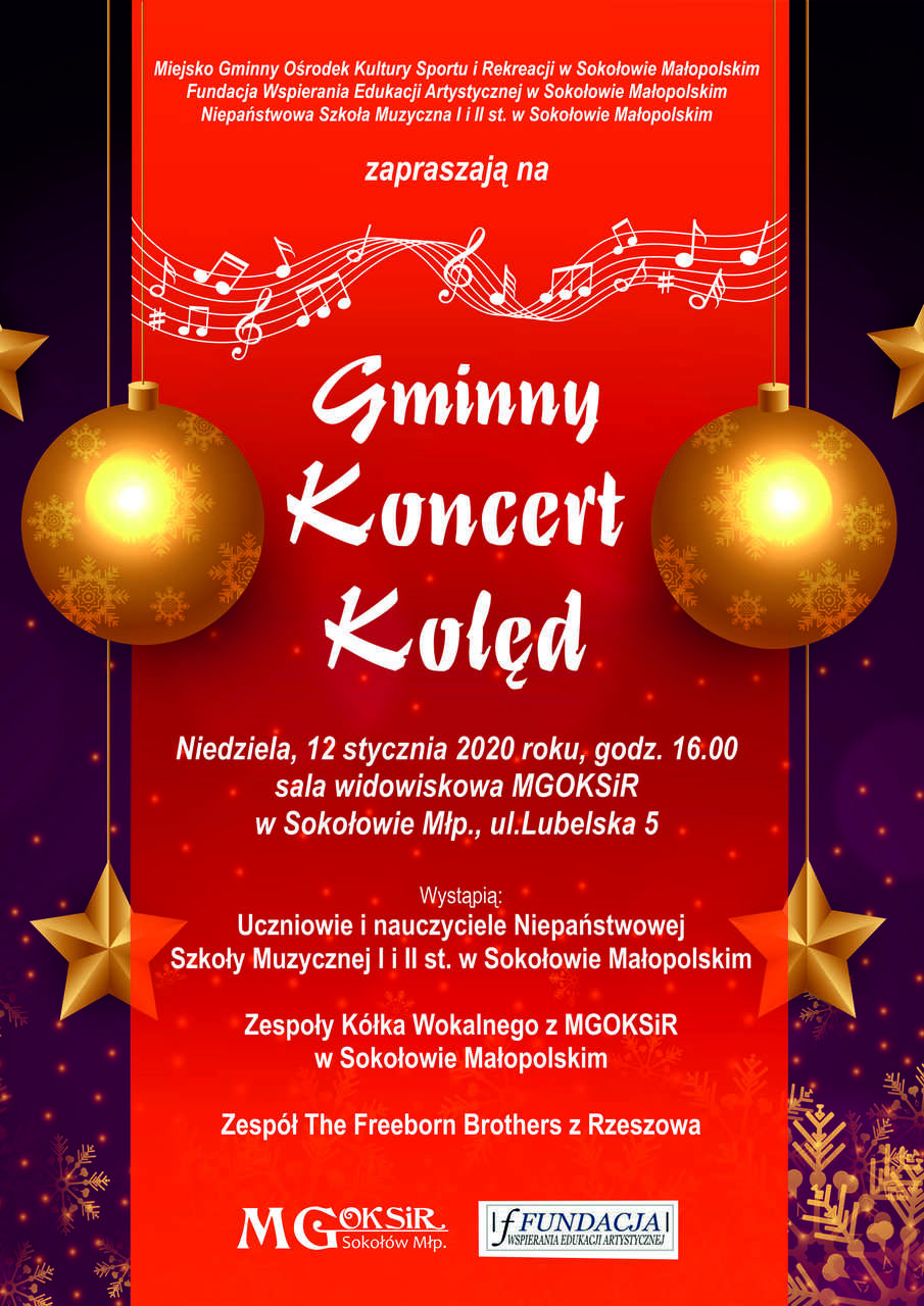 W niedzielę 12 stycznia 2020 roku o godzinie 16.00 w Sali Widowiskowej MGOKSiR w Sokołowie Małopolskim odbędzie się Gminny Koncert Kolęd. Wystąpią: uczniowie i nauczyciele Niepaństwowej Szkoły Muzycznej I i II st. w Sokołowie Małopolskim, zespoły Kółka Wokalnego Miejsko Gminnego Ośrodka Kultury, Sportu i Rekreacji w Sokołowie Małopolskim i Zespół The Freeborn Brothers z Rzeszowa. Organizatorami wydarzenia są: Podkarpacki Zespół Niepaństwowych Szkół Muzycznych, Miejsko Gminny Ośrodek Kultury, Sportu i Rekreacji w Sokołowie Małopolskim i Fundacja Wspierania Edukacji Artystycznej w Sokołowie Małopolskim.