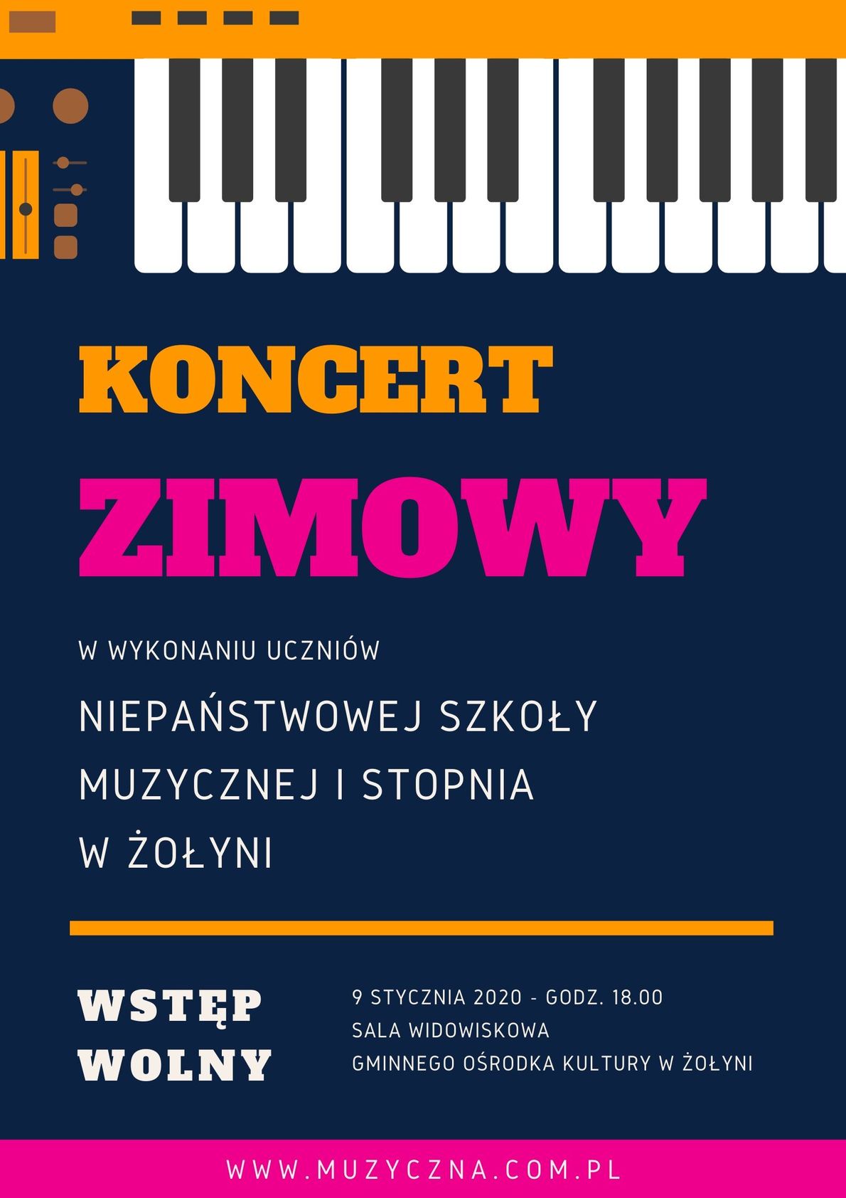 Z przyjemnością informujemy, że w dniu 9 stycznia 2020 roku o godzinie 18.00 w Gminnym Ośrodku Kultury w Żołyni odbędzie się Koncert Zimowy w wykonaniu uczniów Niepaństwowej Szkoły Muzycznej I stopnia w Żołyni. Zaprezentują się uczniowie z sekcji: fortepianu, akordeonu, gitary, saksofonu, fletu poprzecznego i trąbki.