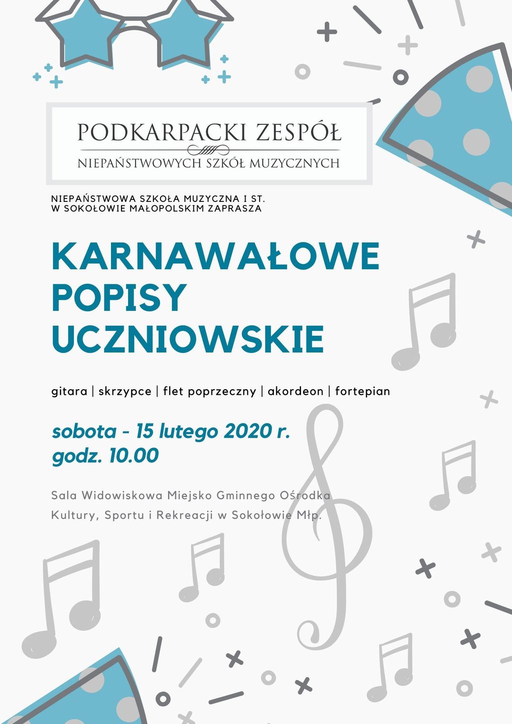 Uprzejmie informujemy, że w sobotę 15 lutego 2020 roku o godzinie 10.00 w Miejsko Gminnym Ośrodku Kultury, Sportu i Rekreacji w Sokołowie rozpoczną się Karnawałowe Popisy Uczniowskie wychowanków Niepaństwowej Szkoły Muzycznej I stopnia w Sokołowie Małopolskim. Na koncercie gościnnie wystąpią także uczniowie z Niepaństwowej Szkoły Muzycznej stopnia w Leżajsku i filii w Sokołowie Małopolskim. Zaprezentują się sekcje fortepianu, akordeonu, fletu poprzecznego, skrzypiec i gitary.