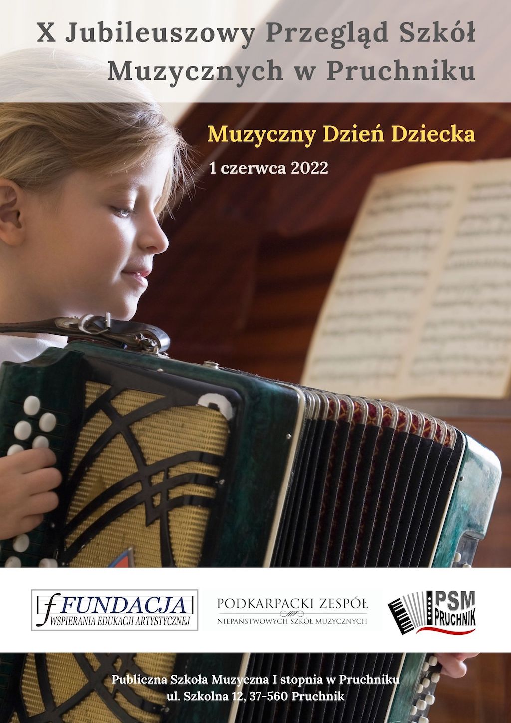 Serdecznie zapraszamy na X Jubileuszowy Przegląd Szkół Muzycznych w Pruchniku pod hasłem “Muzyczny Dzień Dziecka”. Przegląd odbędzie się 1 czerwca 2022 roku w Publicznej Szkole Muzycznej I stopnia w Pruchniku. Regulamin przewiduje udział uczniów publicznych i niepublicznych szkół muzycznych I i II stopnia dowolnych sekcji instrumentalnych i wokalistów solo. Formuła przewiduje przesłuchania konkursowe uczestników prezentujących dwie dowolnie wybrane pozycje repertuarowe. Wykonawcy oceniani są przez jurorów powołanych przez organizatora spośród nauczycieli szkół muzycznych województwa podkarpackiego.