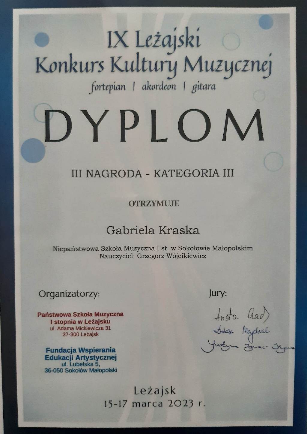 Gabriela Kraska z klasy fortepianu p. Grzegorza Wójcikiewicza w Niepaństwowej Szkole Muzycznej I st. w Sokołowie Małopolskim wzięła udział w IX Leżajskim Konkursie Kultury Muzycznej, który odbył się w dniach 15-17 marca 2023 roku w Państwowej Szkole Muzycznej I st. w Leżajsku. Z dużą satysfakcją informujemy, że uczennica otrzymała III NAGRODĘ w Kategorii III. Konkurs ma zasięg ogólnopolski.