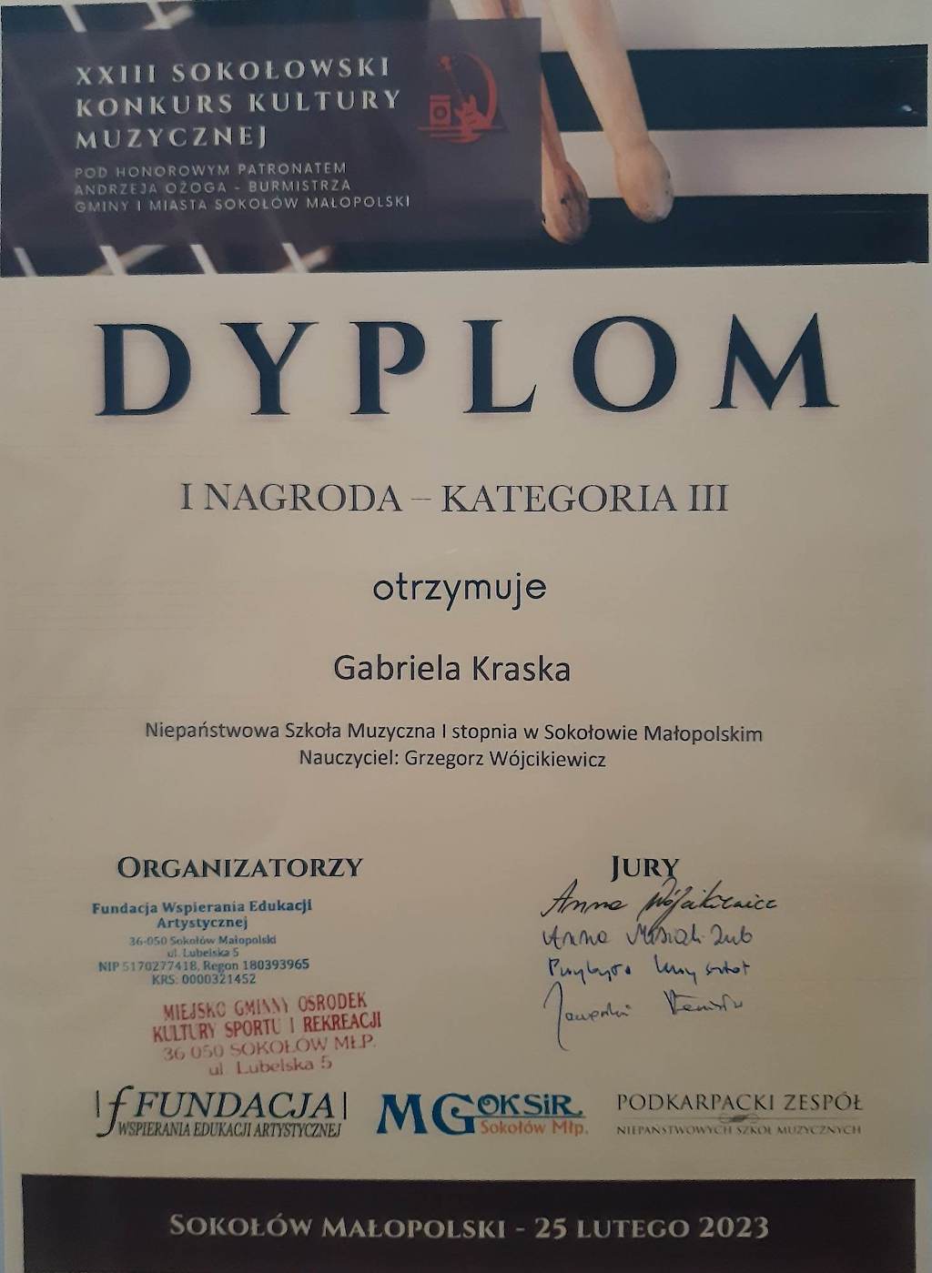 Gabriela Kraska z klasy fortepianu p. Grzegorza Wójcikiewicza w Niepaństwowej Szkole Muzycznej I st. w Sokołowie Małopolskim wzięła udział w XXIII Sokołowskim Konkursie Kultury Muzycznej, który odbył się 25 lutego 2023 roku w Miejsko Gminnym Ośrodku Kultury Sportu i Rekreacji w Sokołowie Małopolskim. Z dużą satysfakcją informujemy, że uczennica otrzymała I NAGRODĘ w Kategorii III. Konkurs ma zasięg ogólnopolski.