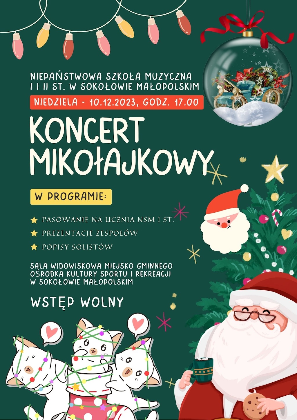 Dyrekcja Podkarpackiego Zespołu Niepaństwowych Szkół Muzycznych zaprasza na Koncert Mikołajkowy, który odbędzie się 10 grudnia 2023 roku o godzinie 17.00 w Miejsko Gminnym Ośrodku Kultury Sportu i Rekreacji w Sokołowie Małopolskim. Wystąpią uczniowie Niepaństwowej Szkoły Muzycznej I i II st. w Sokołowie Małopolskim. W programie: pasowanie uczniów klas pierwszych, prezentacje zespołów i popisy solistów.