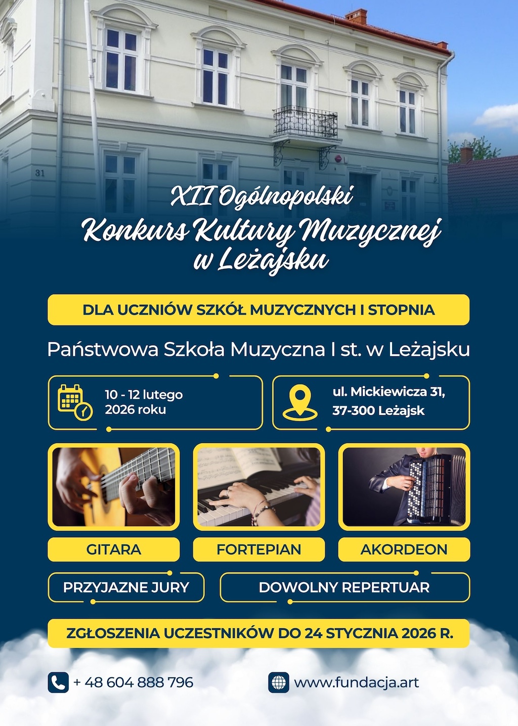 Serdecznie zapraszamy na XII Ogólnopolski Konkurs Kultury Muzycznej w Leżajsku skierowany do uczniów sekcji akordeonu, fortepianu i gitary szkół muzycznych pierwszego stopnia.
