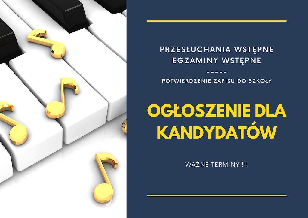 Zapraszamy do zapoznania się z dodatkowymi terminami badania przydatności (przesłuchań) do kształcenia muzycznego w szkole muzycznej I stopnia i terminami egzaminów wstępnych do szkoły muzycznej II stopnia. TERMINY PRZESŁUCHAŃ I EGZAMINÓW: Niepaństwowa Szkoła...