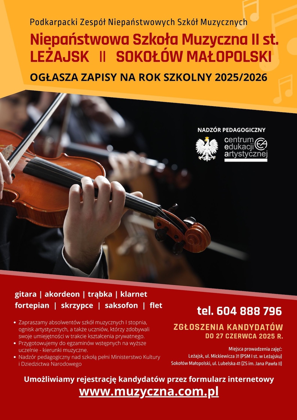- Kandydaci / rodzice wypełniają kwestionariusz i składają w sekretariacie Państwowej Szkoły Muzycznej I st. w Leżajsku do 27 czerwca 2025 roku.