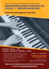 - Absolwenci szkół muzycznych I st. Podkarpackiego Zespołu Niepaństwowych Szkół Muzycznych i Państwowej Szkoły Muzycznej I st. w Leżajsku są zwolnieni z egzaminu wstępnego.